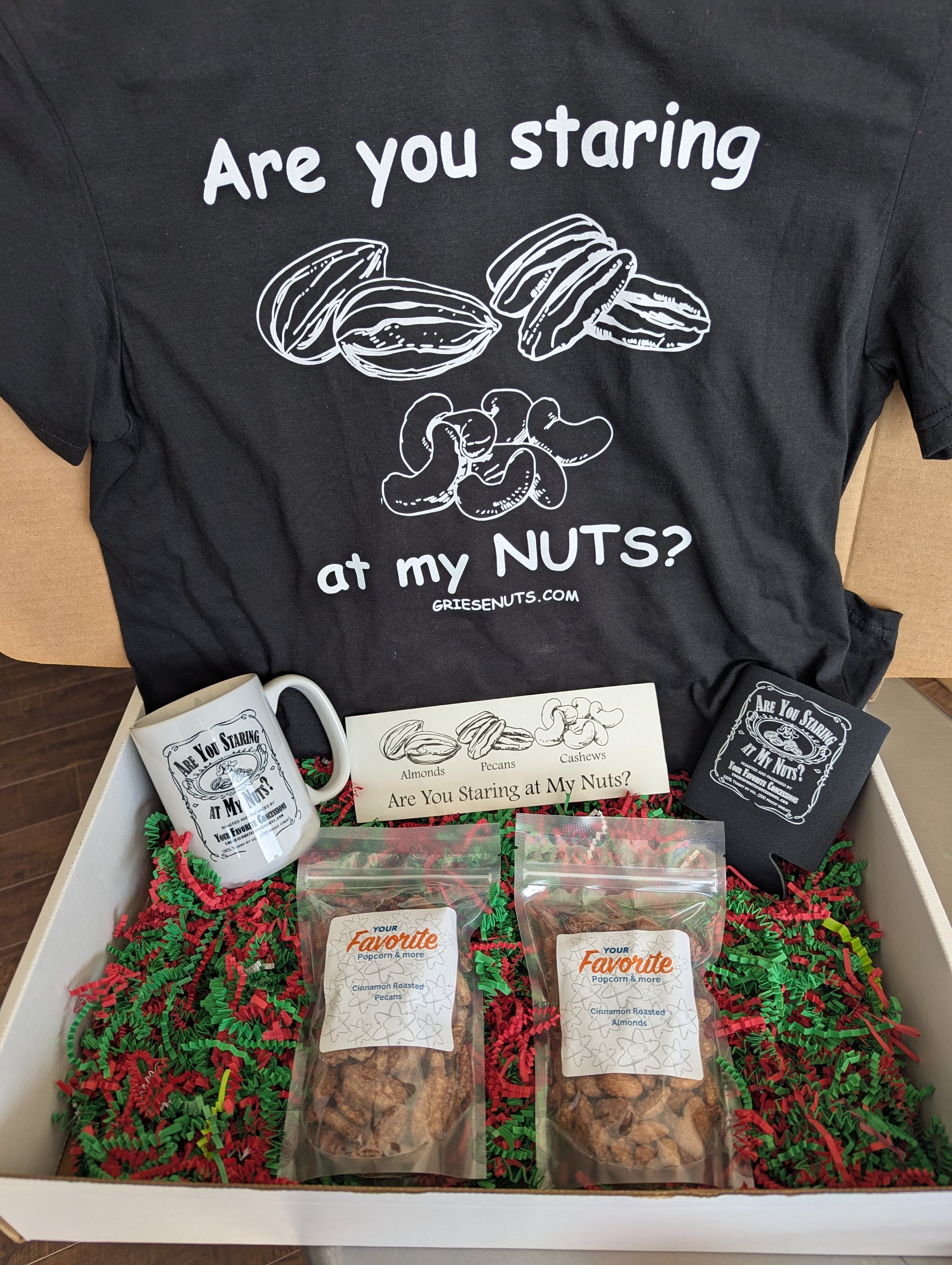 Included: tshirt, mug, stickers in the style of your choosing along with the best of Griese Nuts. Packed and Shipped for you!